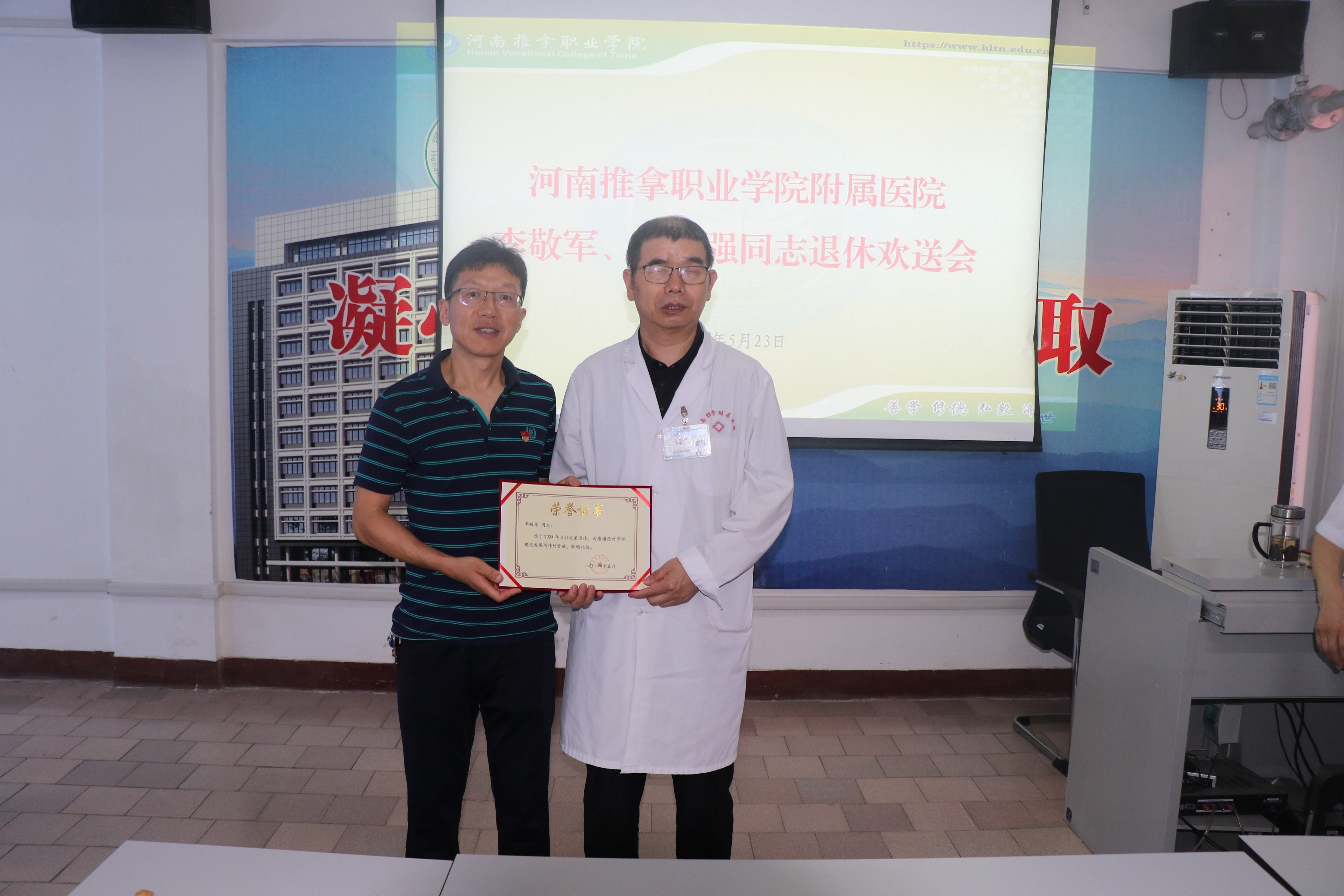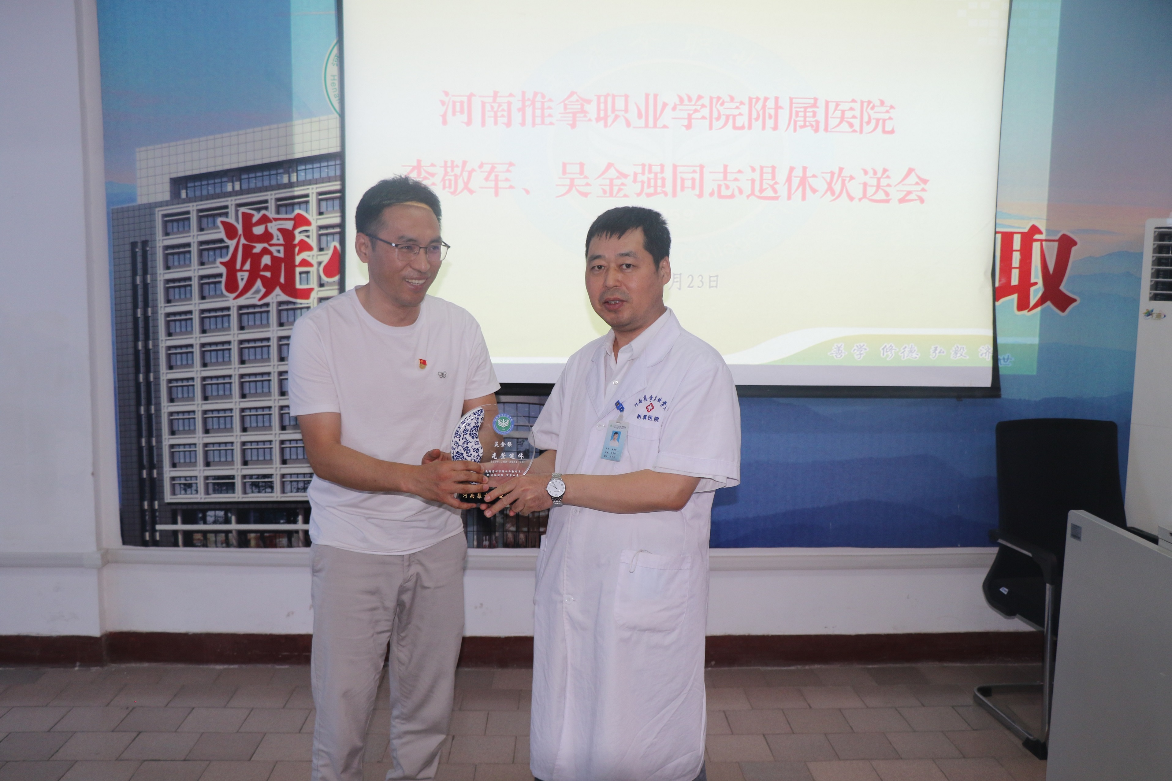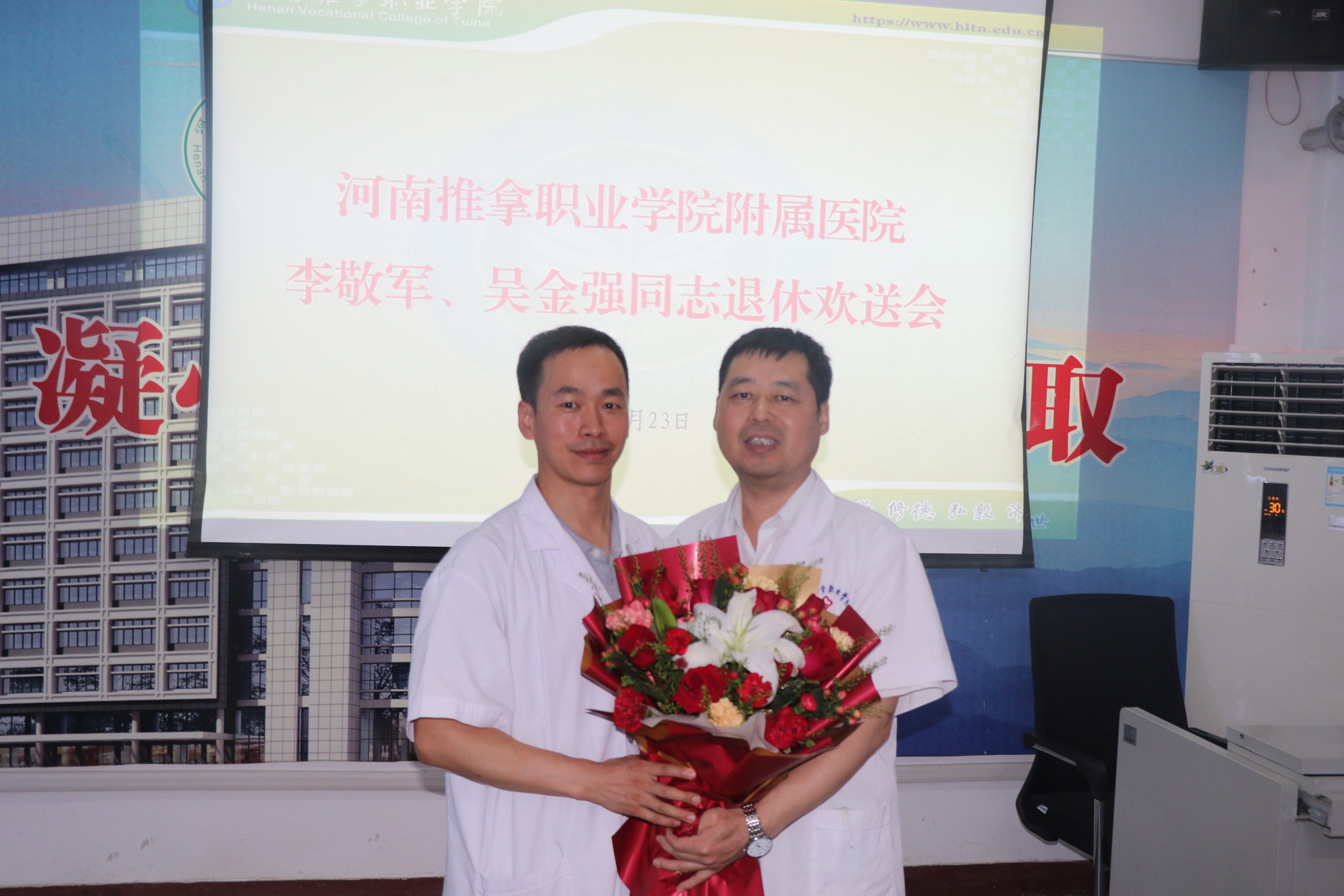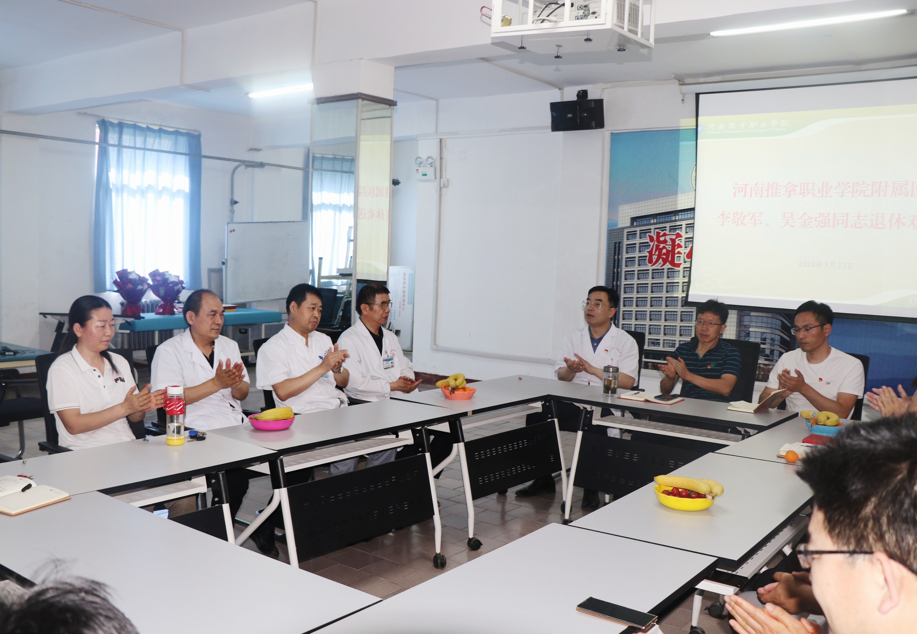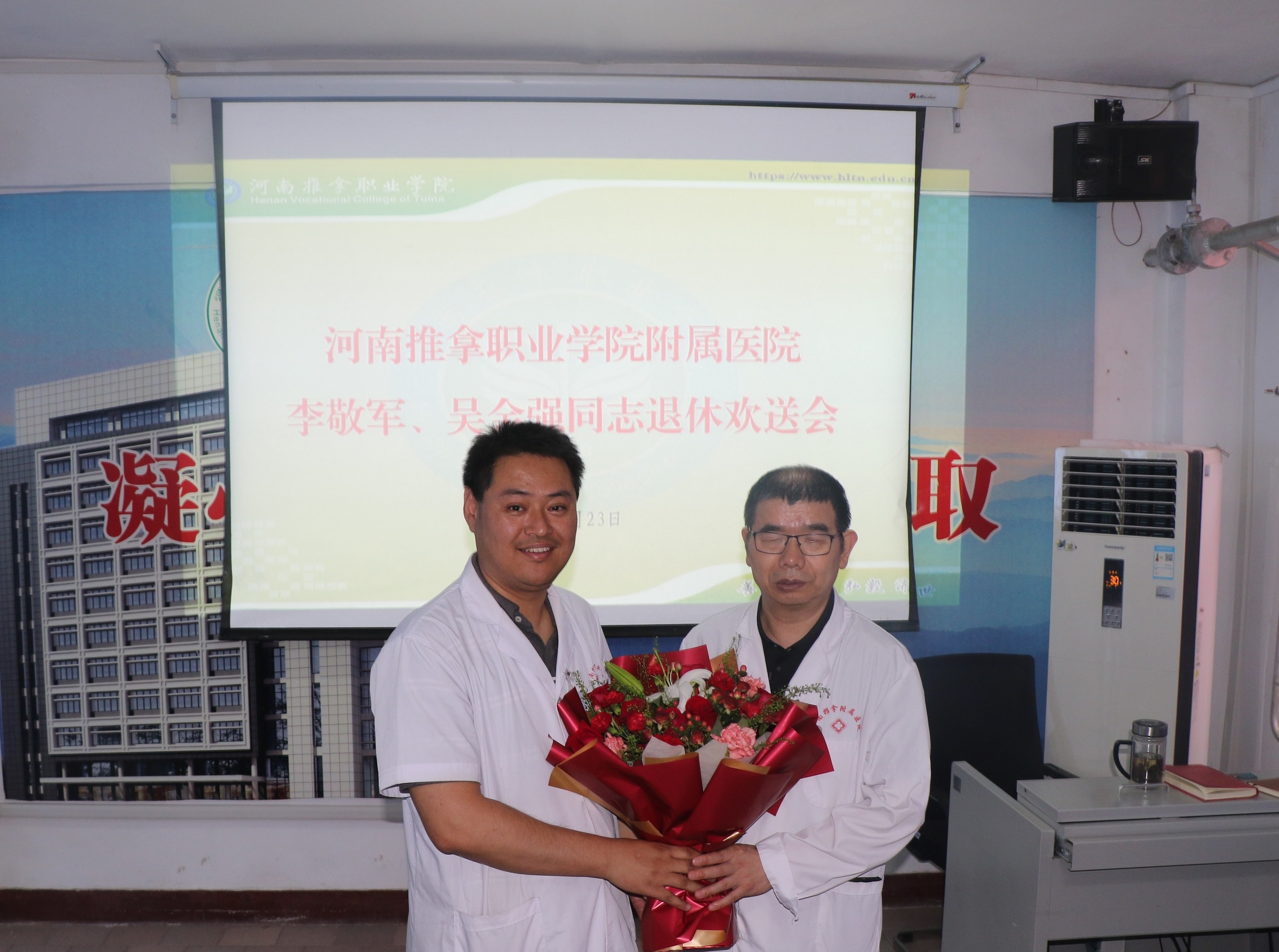 2024年5月23日,河南推拿职业学院附属医院在五楼会议室召开李敬军、吴金强退休欢送会。会议首先由张会理主任介绍两位职工的从医经历,工作态度和为医院作出的贡献,祝福两位同志光荣退休。接着院领导班子致欢送辞,院长刘国宝回顾了与两位退休同志共同工作的往事,充分肯定了两位同志为医院发展作出的贡献,表达了全体职工对两位同志的美好祝愿。同时他也衷心地希望他们在合理、科学安排好自己晚年生活的同时,继续为医院的发展献计献策,希望退休后常回医院看看。真诚地祝愿退休同志们在今后生活中心情舒畅,老有所乐,健康长寿,阖家幸福!