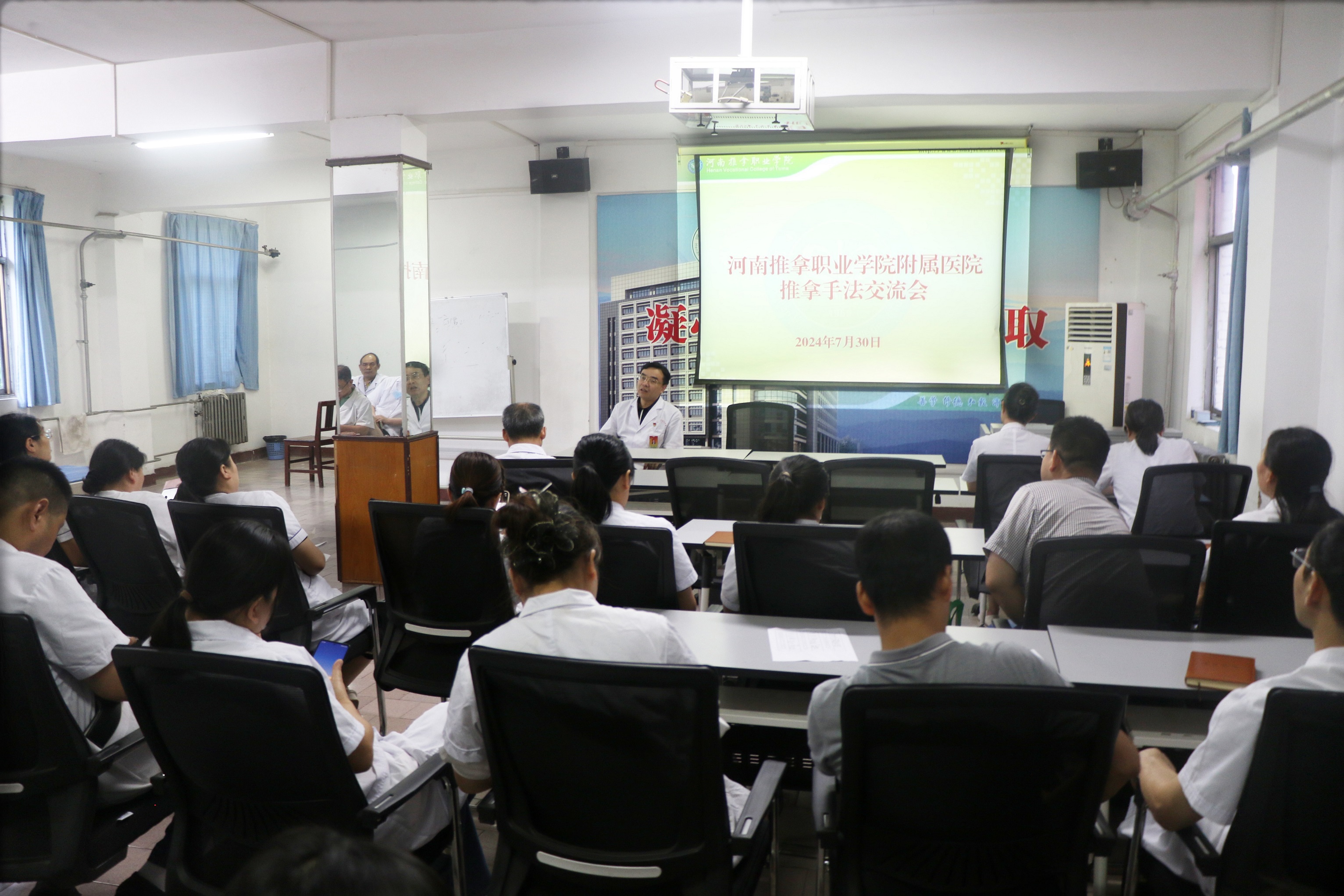 为更好的弘扬“河洛推拿”精神,传承中医特色手法,推进附属医院推拿技术的发展,为群众提供更加优质的中医特色服务,7月30日,河南推拿职业学院附属医院举办了推拿技术交流活动,本次会议由副院长崔华授课,医院所有医务人员及专业技术人员参与此次交流会。