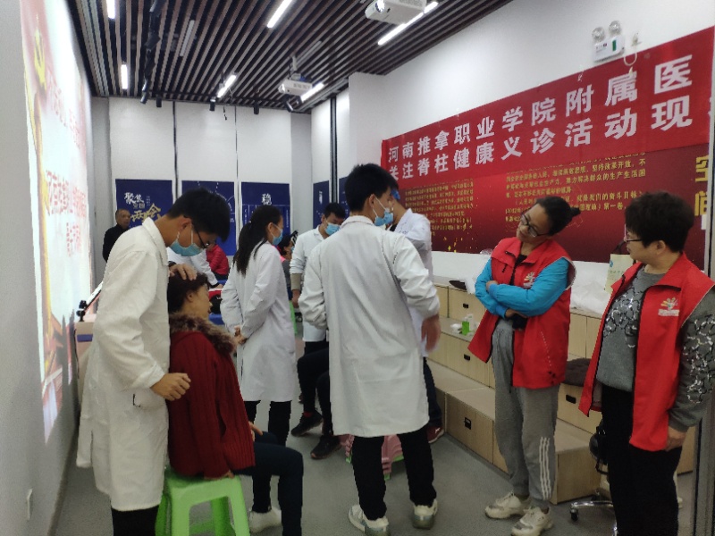 为提高社区居民的健康意识和自我保健意识,10月21日下午2点30分,河南推拿职业学院附属医院骨关节病科主任李宏龙、马培主治医师及康复科医师申彩红等7人组成的医疗团队走进湖北路社区党群共享空间进行“关爱脊柱”健康义诊活动。