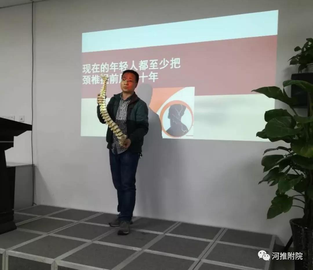 3月30日晚七点,受中国平安洛阳分公司邀请,河南推拿职业学院附属医院医办室主任兰天带领两名治疗师,走进中国平安洛阳分公司进行“颈椎病预防保健-健康知识”公益讲座。