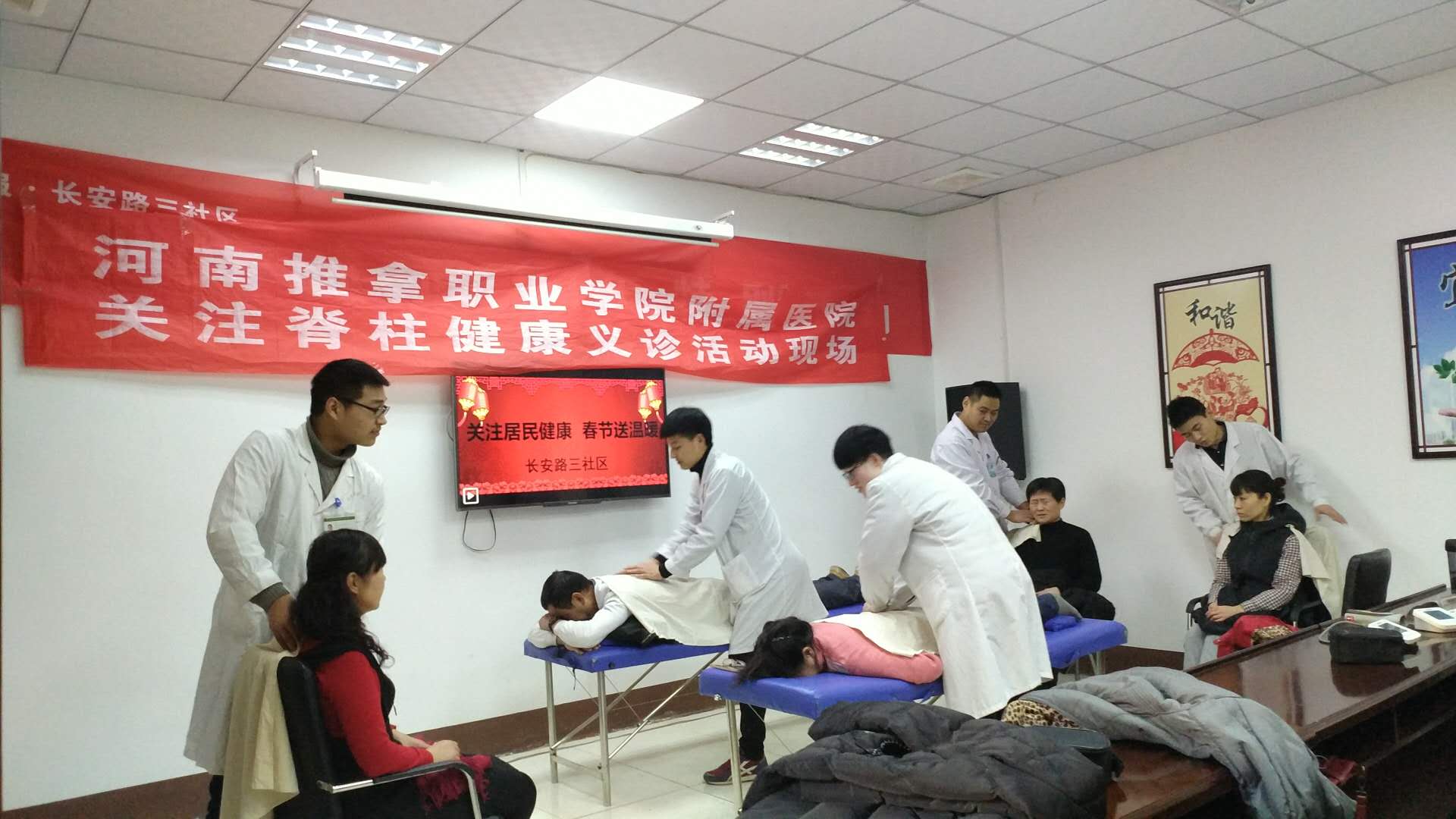 新年的脚步悄然而至,为了提高社区居民的脊柱健康知识水平,增强社区居民的脊柱健康保护意识,让大家在家门口就能享受到免费的医疗服务。2018年2月7日下午,河南推拿职业学院附属医院推拿科5名推拿医生在推拿科李宏龙主任的带领下,走进洛阳市涧西区长安路第三社区进行“关爱脊柱健康、迎新春送温暖”公益健康义诊活动,用中医推拿特色疗法为社区60余名居民群众送上了冬日里的新年健康祝福。
