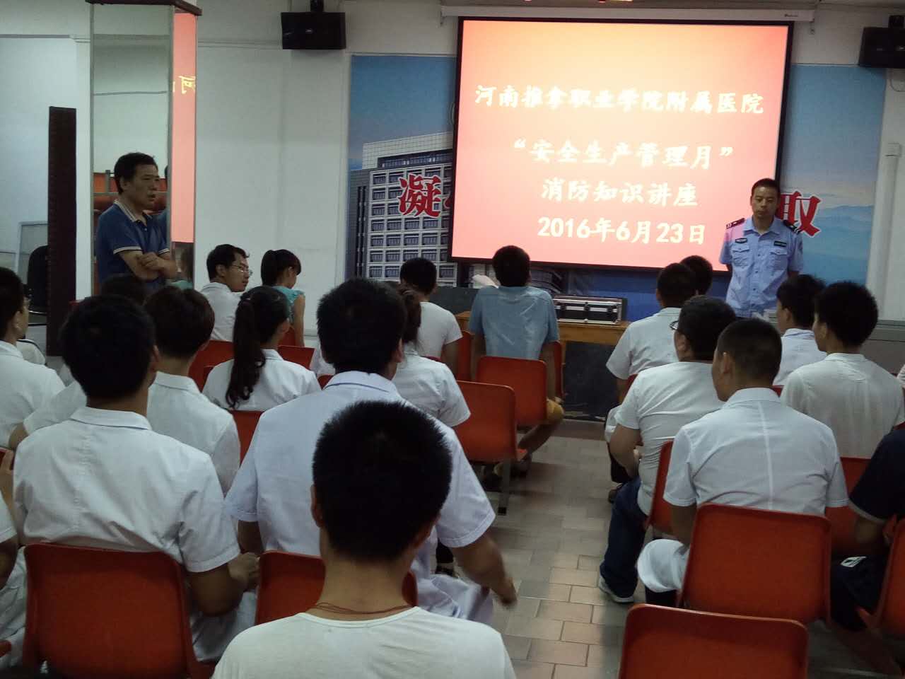 按照学院、涧西区关于做好“安全生产月”活动的通知要求,为进一步确保医院安全,提高全院职工及进修、实习生的安全防范意识,坚决杜绝火灾及其他安全事故的发生,6月23日下午5:00,由院总务科组织在五楼会议室开展了一场消防安全知识讲座,,我院全体职工及全体进修、实习生参加。