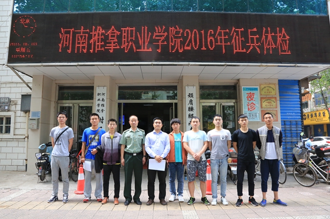 6月3日上午,根据学院武装部2016年征兵工作安排,在我院对学院2016年大学生应征入伍预征对象进行体检。我院接到任务后,积极做好前期准备工作,抽调一线专业人员全方位做好体检服务工作,经过抽血化验、外科、视力、听力等方面的检查,8名同学全部通过体检测试。洛龙区武装部相关领导来到体检现场指导工作,对我院征兵体检工作给予了肯定和认可。