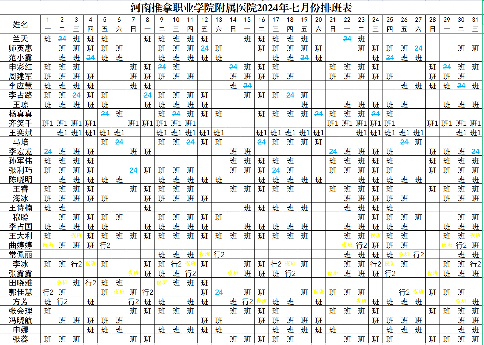 河推附院2024年7月医师排班