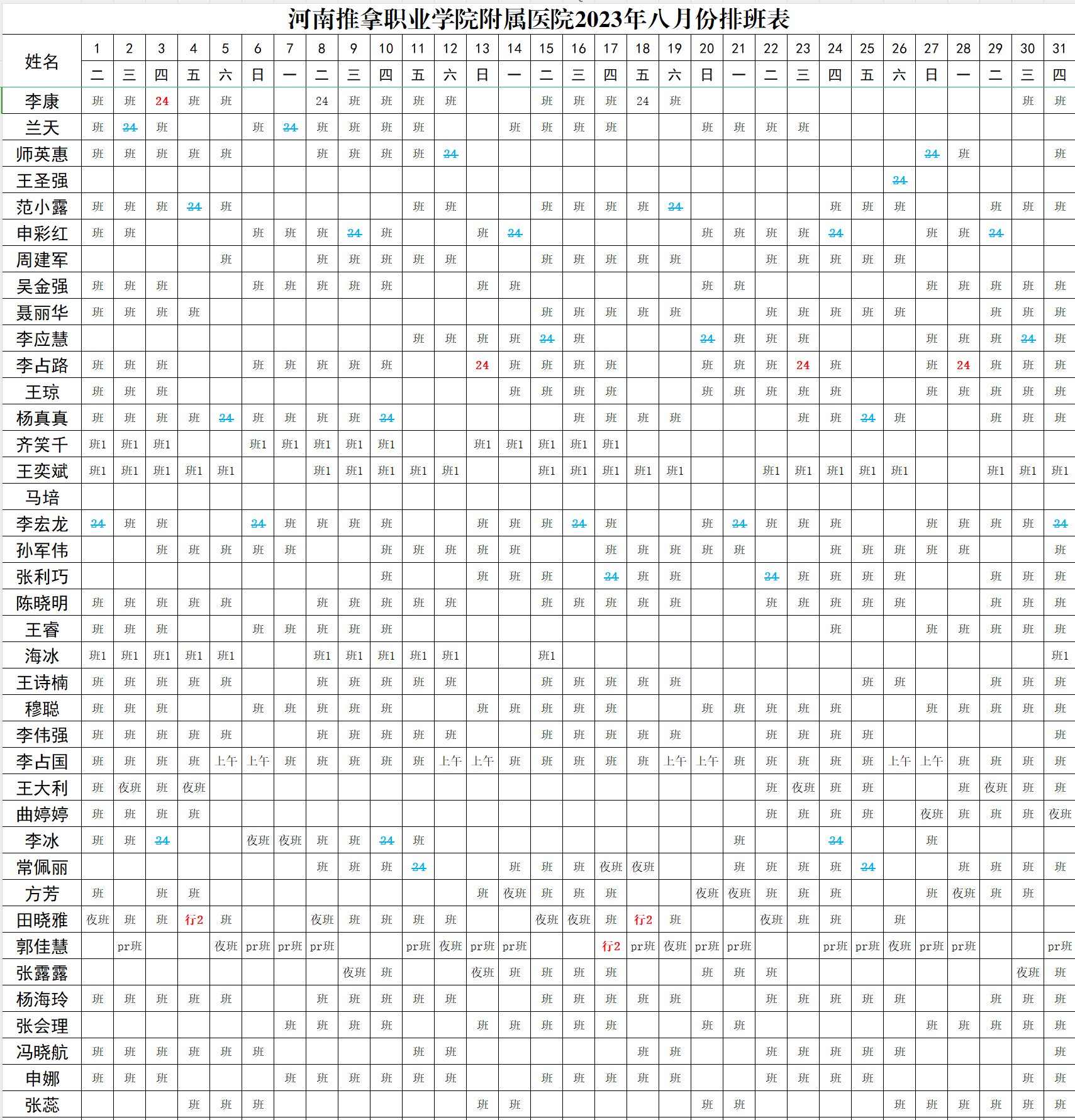 河推附院2023年8月医师排班