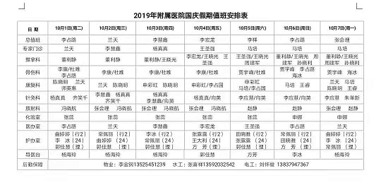 根据学院2019年国庆节放假安排通知,结合医院工作实际,我院2019年国庆节放假安排如下: