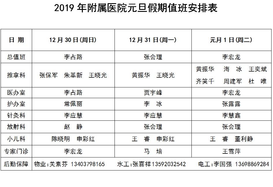 根据学院关于2019年元旦放假安排的通知精神,我院定于12月30日至1月1日放假三天。假日期间,医院各科室不停诊。请各位病友根据以下医师值班安排提前预约。为此给您带来的不便,敬请谅解。