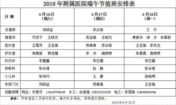 : 根据学院端午节放假通知:6月16日至6月18日放假三天,6月19日(星期二)正常上班。期间医院诊疗工作正常开展,医师出诊安排如下: