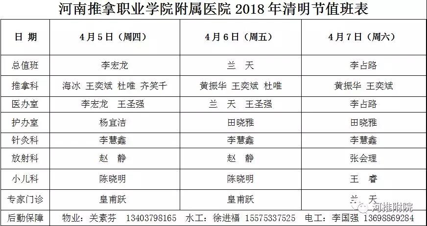 根据学院清明节放假通知:4月5日至7日放假三天,4月8日(星期日)正常上班。期间医院诊疗工作正常开展,医师出诊安排如下:
