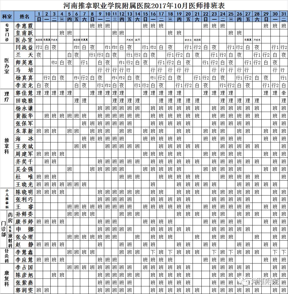 河推附院10月份医师排班表